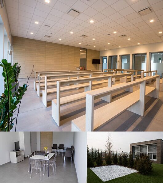 Sala del Commiato - Ampia, sobriamente arredata, con spazio verde dedicato esterno, luminosa, puo' ospitare fino a ottanta persone sedute e sessanta in piedi.